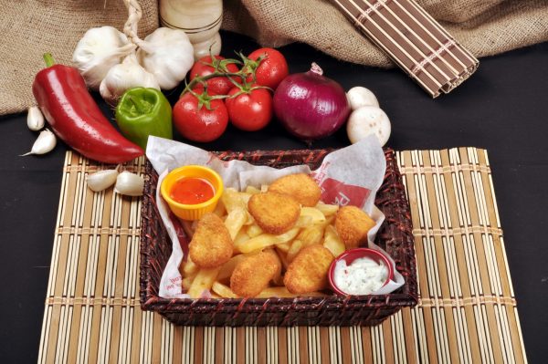 Nugget parçaları, cips, ketçap, mayonez ve ranch sos ile servis edilir.